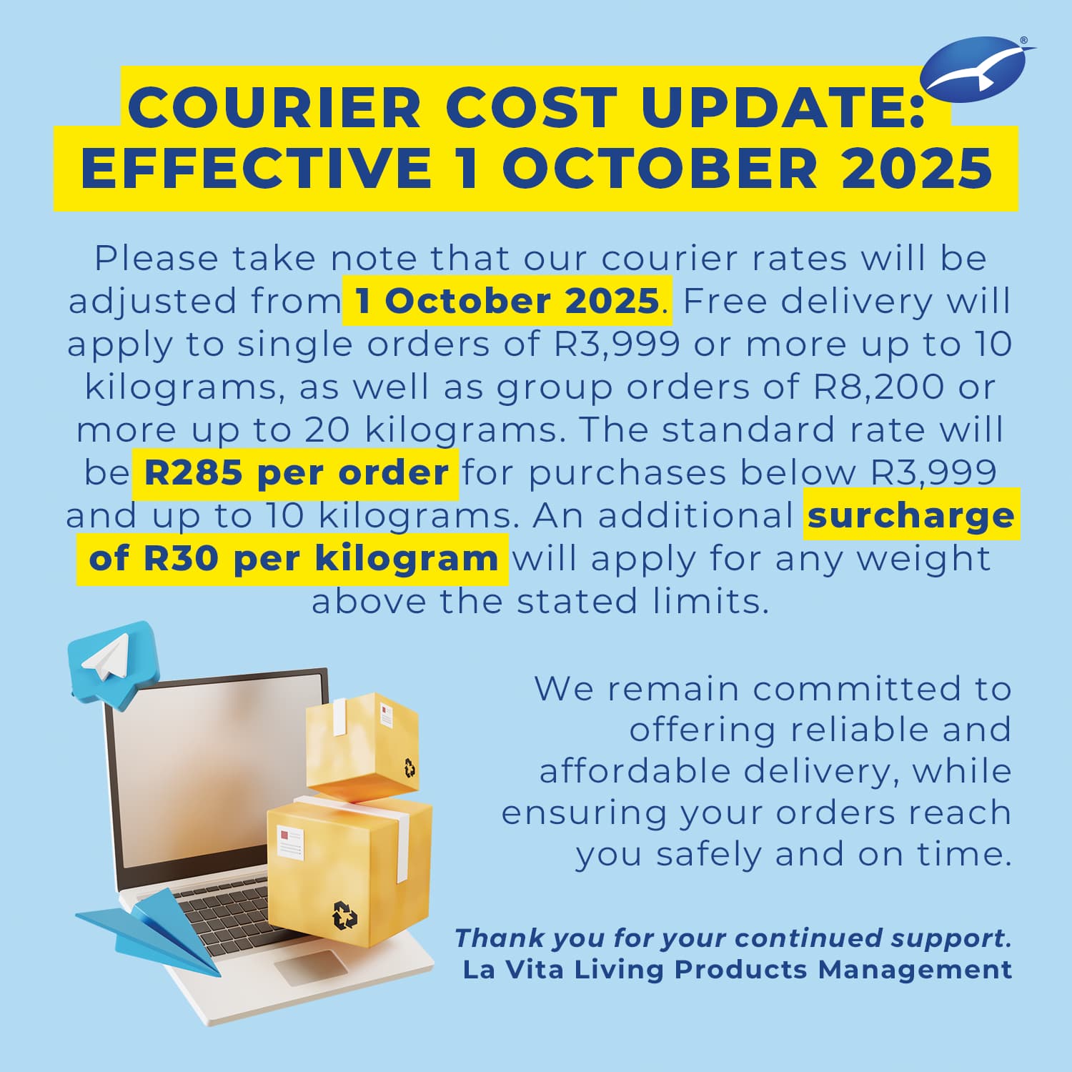 Important notice: Please note that our courier prices will change from 1 October 2025. Free delivery will still be available for qualifying orders. Other orders will be subject to the standard fee or any additional charges as outlined in the official notice. Thank you for your continued support. La Vita Living Products Management. T&Cs apply.