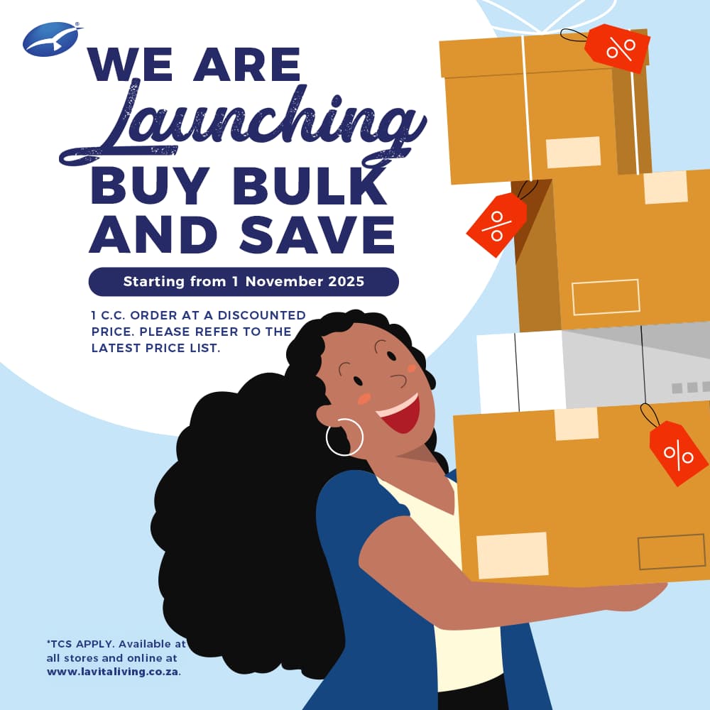 Buy Bulk & Save is here! Starting from 1 November 2025, enjoy discounted prices when you order 1CC or more of your favourite La Vita Living Products. Please refer to the latest price list for details. Shop more, spend less, and take advantage of this great value promotion. Available in-branch and online at www.lavitaliving.co.za. Promotion valid from 01 November 2025. T&Cs apply. Available while stock lasts.