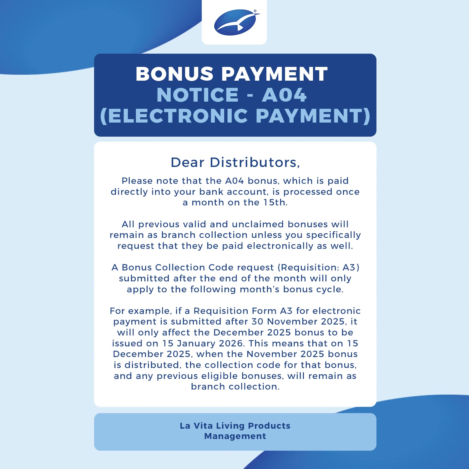 Important notice to distributors: Please take note of the updated A04 bonus payment process. All electronic payments are now issued once a month on the 15th. Kindly review the notice to ensure you understand how and when your bonuses will be paid. T&Cs apply.