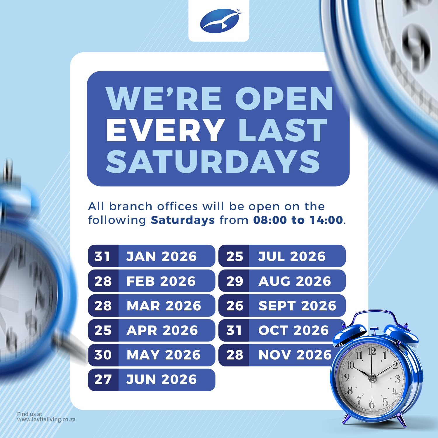 Important notice to distributors. Due to operational constraints, please note that the La Vita Living Products Bloemfontein branch (FS02) will be permanently closed as of 23 January 2026. Distributors are kindly requested to make use of alternative LVLP branches or our online portal for all future orders and support. Please note that all distributors currently registered under area code FS02 will be automatically transferred to FS01. Thank you for your understanding and continued support. La Vita Living Products Management.