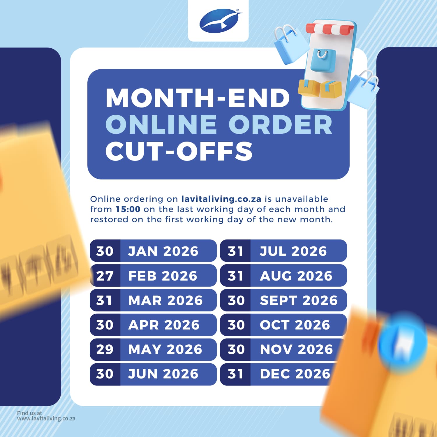 Important notice: Online ordering on the La Vita Living Products website will be unavailable from 15:00 on the last working day of each month and will be restored on the first working day of the new month. Please ensure your orders are placed in time to avoid inconvenience.