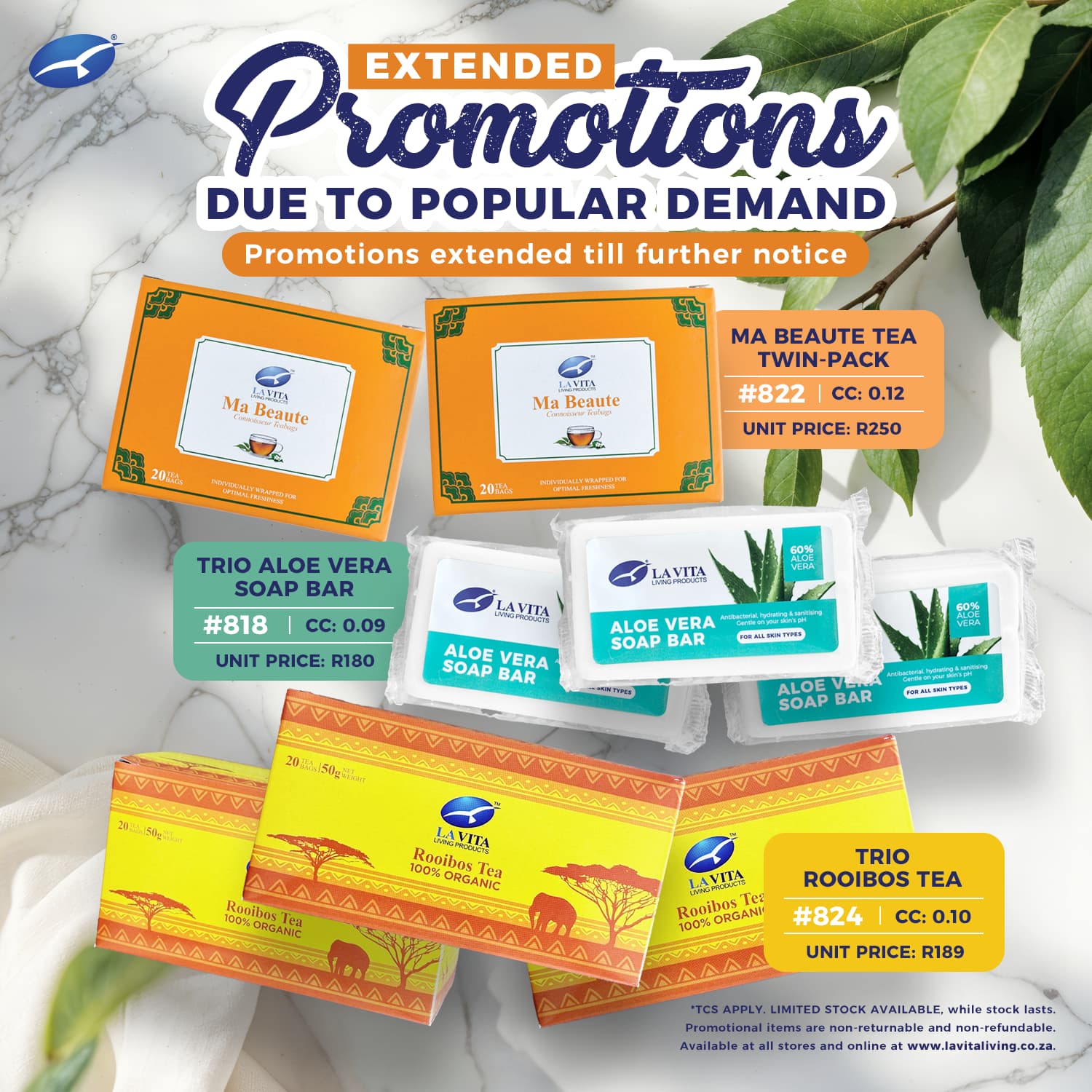 Due to popular demand, selected La Vita Living Products favourites remain on promotion for a little longer, with this offer extended until further notice. Enjoy exceptional value on our Ma Beauté Tea Twin-Pack (R250), Trio Aloe Vera Soap Bars (R180), and Trio Rooibos Tea (R189). Available in-branch and online while stocks last. T&Cs apply. Promotional items are non-returnable and non-refundable.