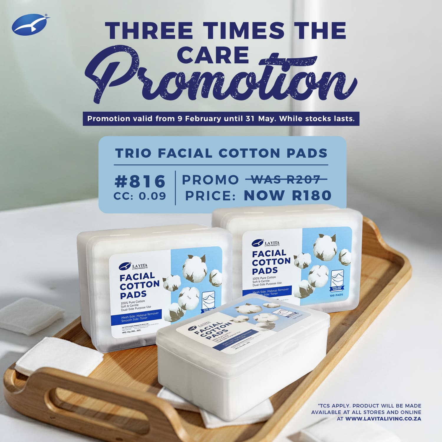 Now available: La Vita Living Products Facial Cotton Pads are made from 100% pure cotton and are ultra-soft, gentle on the skin, and perfect for dual use. The textured side removes makeup and impurities, while the smooth side is ideal for applying toner. A must-have for your daily skincare routine. Available in-branch and online at www.lavitaliving.co.za. T&Cs apply.