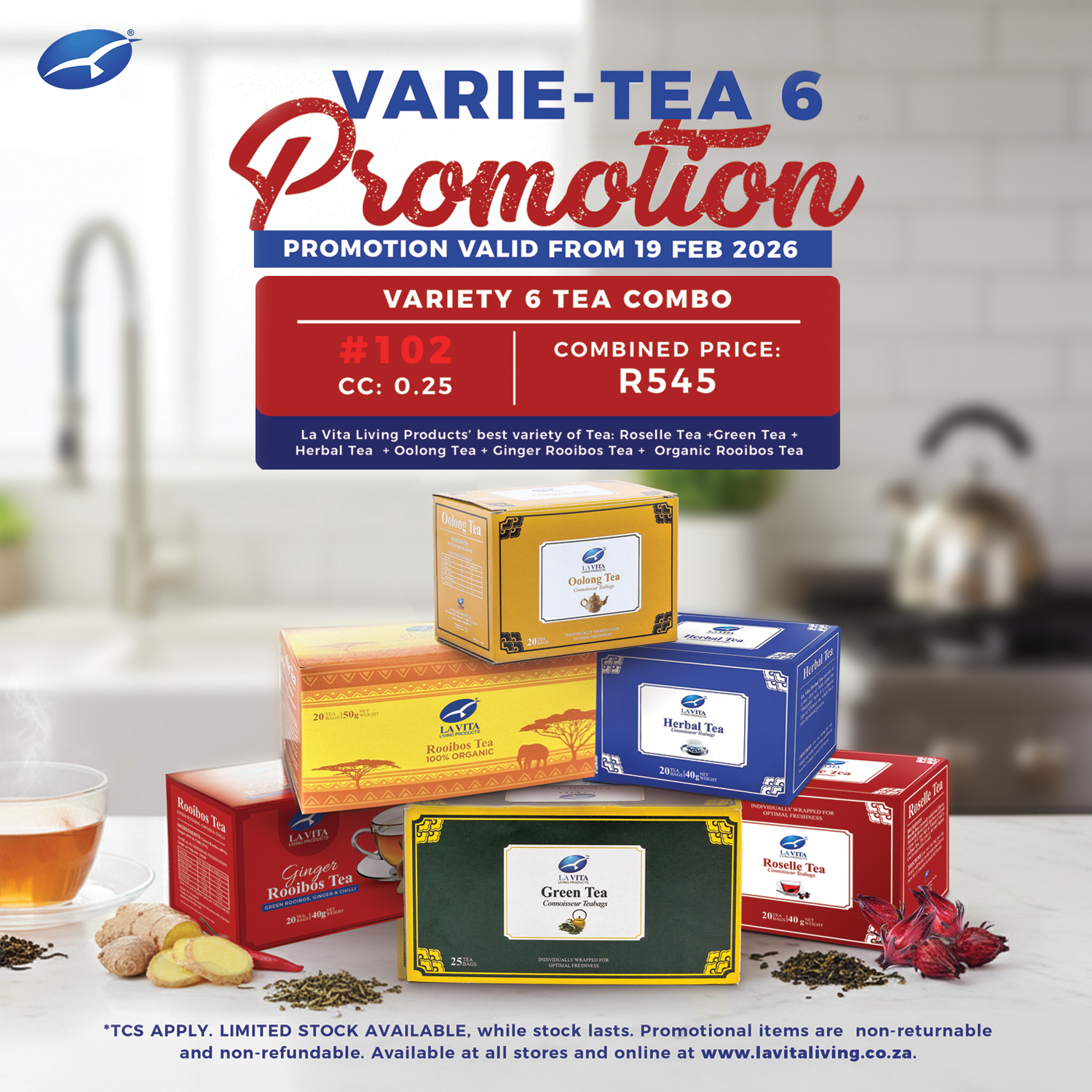 A perfect blend for every tea lover — The Variety 6 Tea Combo from La Vita Living Products brings together Roselle Tea, Green Tea, Herbal Tea, Oolong Tea, Ginger Rooibos Tea, and Organic Rooibos Tea in one exceptional value pack. Enjoy a rich selection of flavours and wellness benefits for only R545 combined. Discover your favourites and elevate your daily routine with this limited-time promotion — Live the La Vita Life.